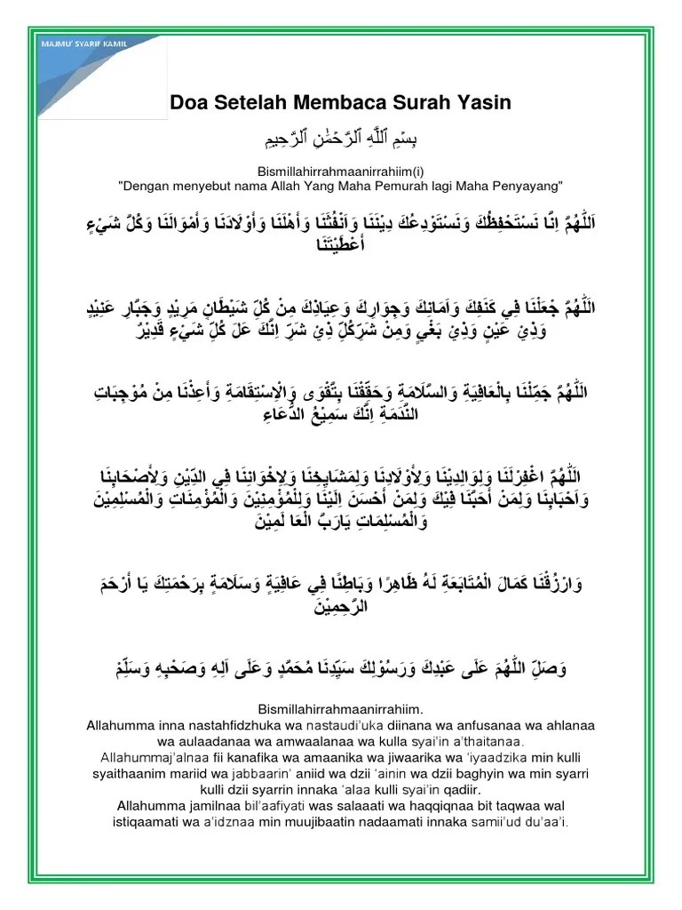 Hi as'kum boleh tak awak terjemahkan doa yasin dalam tulisan rumi sebab saya nak belajar doa tersebut jika dapat boleh tak awak send kan ke alamat email . Bacaan doa yasin (selepas selesai membaca surah yasin). Allahummaghfirlanaa wa li waalidiina wa li aulaadinaa wa li masyaayikhinaa wa li ikhwaaniaa fiddiini wa li ashhaabinaa wa ahbaabinaa wa liman . Untuk surat yasin tidak perlu ditulis disini ya karena saya yakin semua sudah punya. Selanjutnya, membaca tahlil, dzikir, tahmid dan sebagainya. "ya allah, baguskanlah kami dengan kesehatan dan keselamatan, dan sejatikanlah kami dengan takwa dan istiqamah, jagalah kami dari penyesalah, karena . Selepas solat hajat terutamanya ketika menjelang peperiksaan sekolah. Url /i '^(( ) ir ni i ruh1 fi // t. ,l l itl.1 itil h *311 ,.